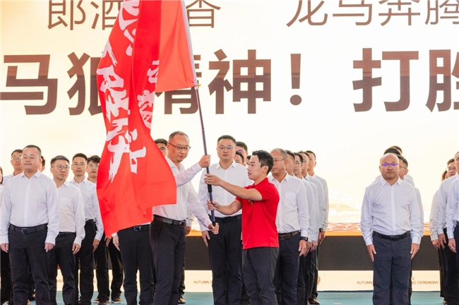 而随后的一幕,则让现场更为沸腾。郎酒兼香事业部的销售团队列队誓师,从邹凯手中接过象征使命的旗帜。这一刻,抽象的“冠军精神”找到了现实的承载者,转化成了销售团队“打胜仗”的昂扬斗志。